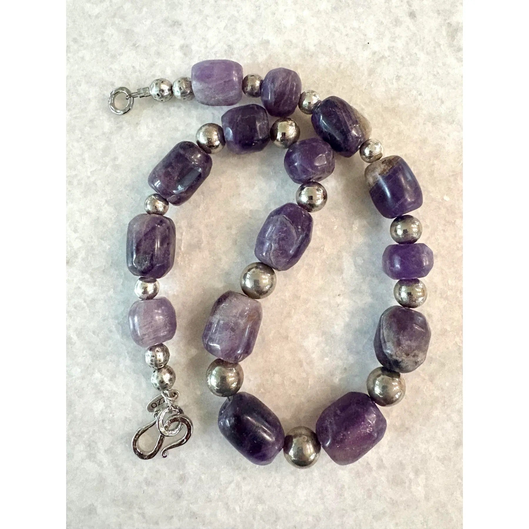Collar de cuentas de amatista antiguas precolombinas talladas a mano con separadores de plata, re-ensartado