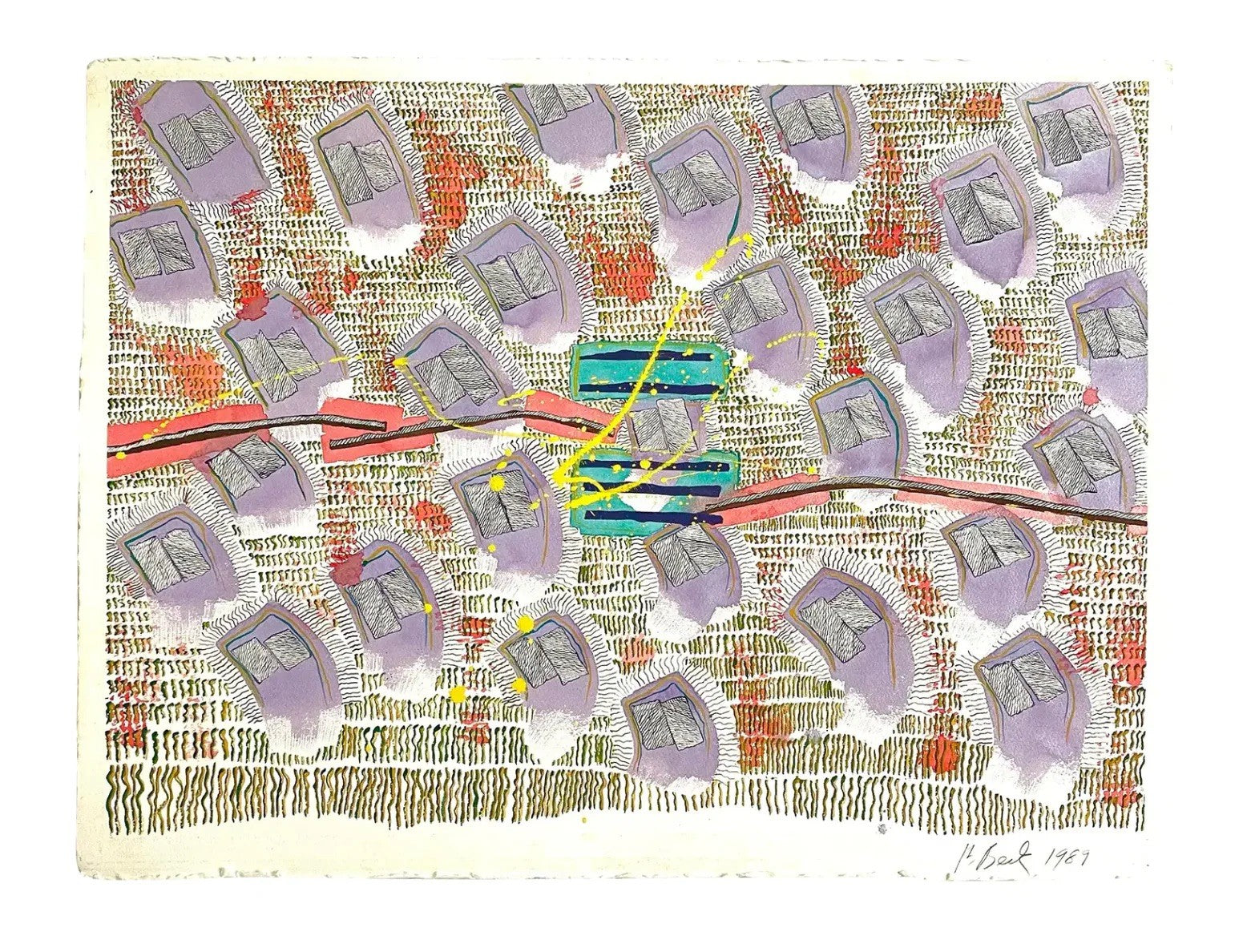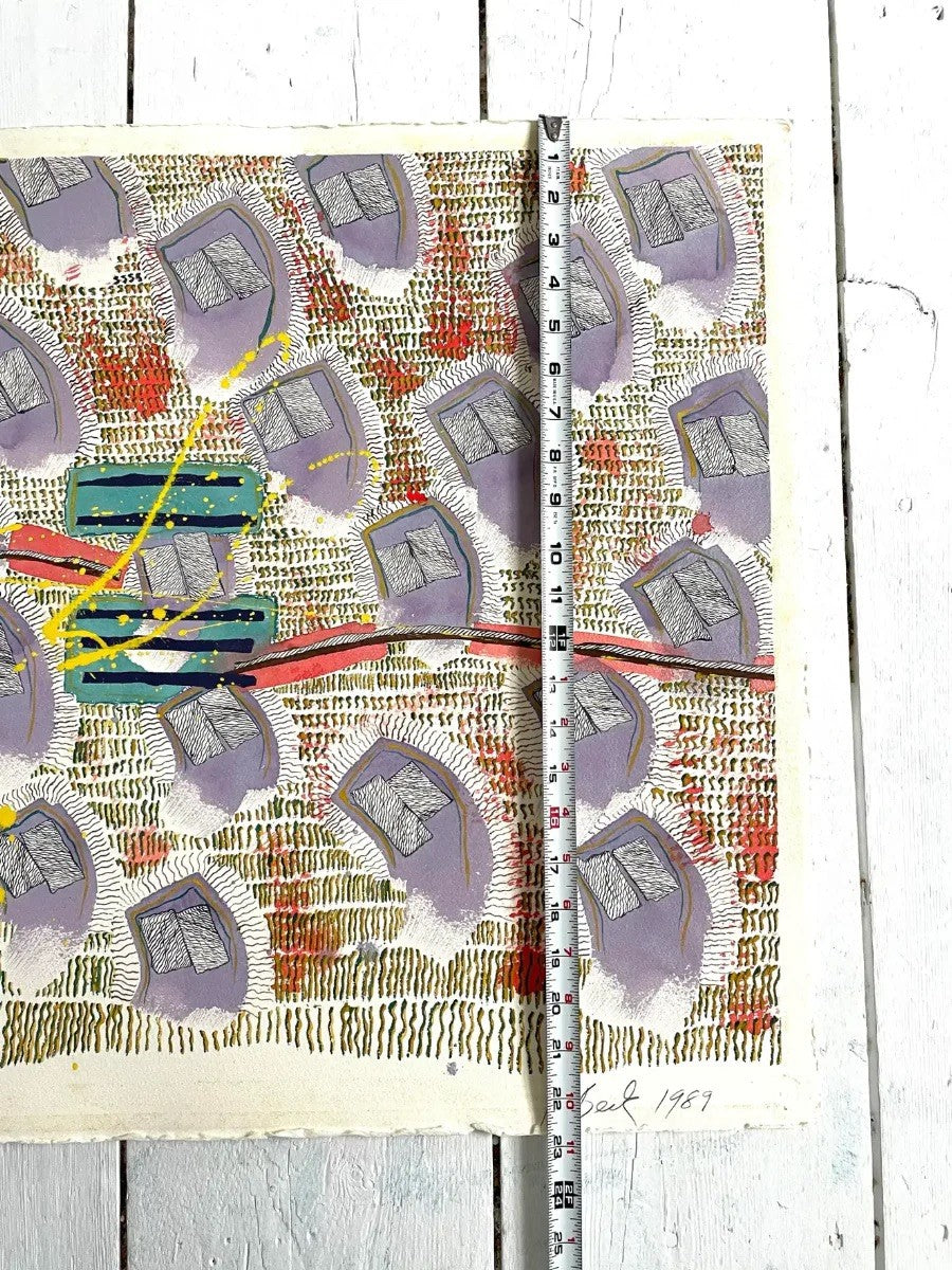 Pintura acrílica abstracta de Barbara Beck de 1989 sobre papel - Firmada, fechada, sin enmarcar