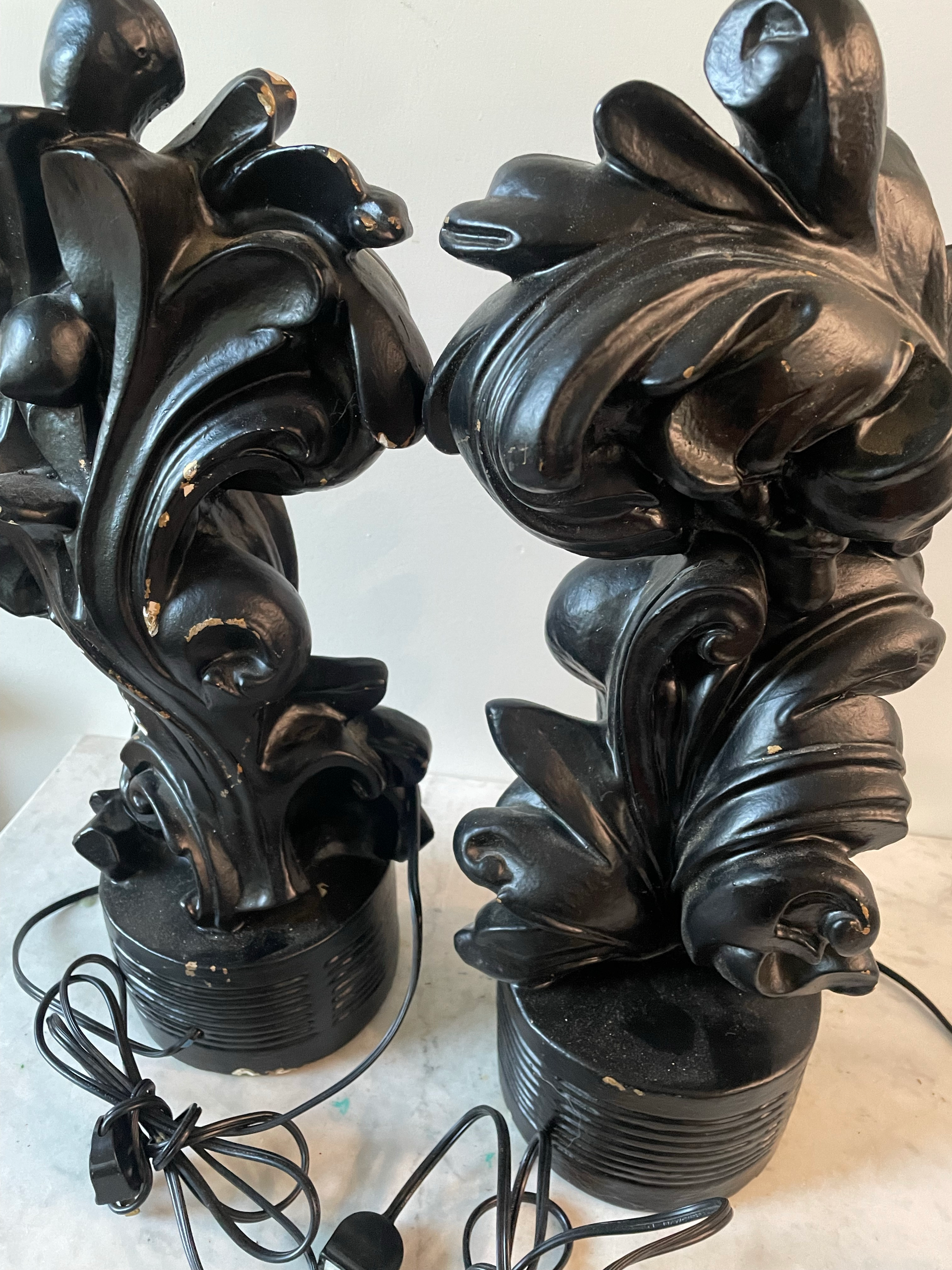 Exquisito par de lámparas estilo Hollywood Regency hechas de yeso y pintadas de negro. Recableadas y en buen estado de funcionamiento.