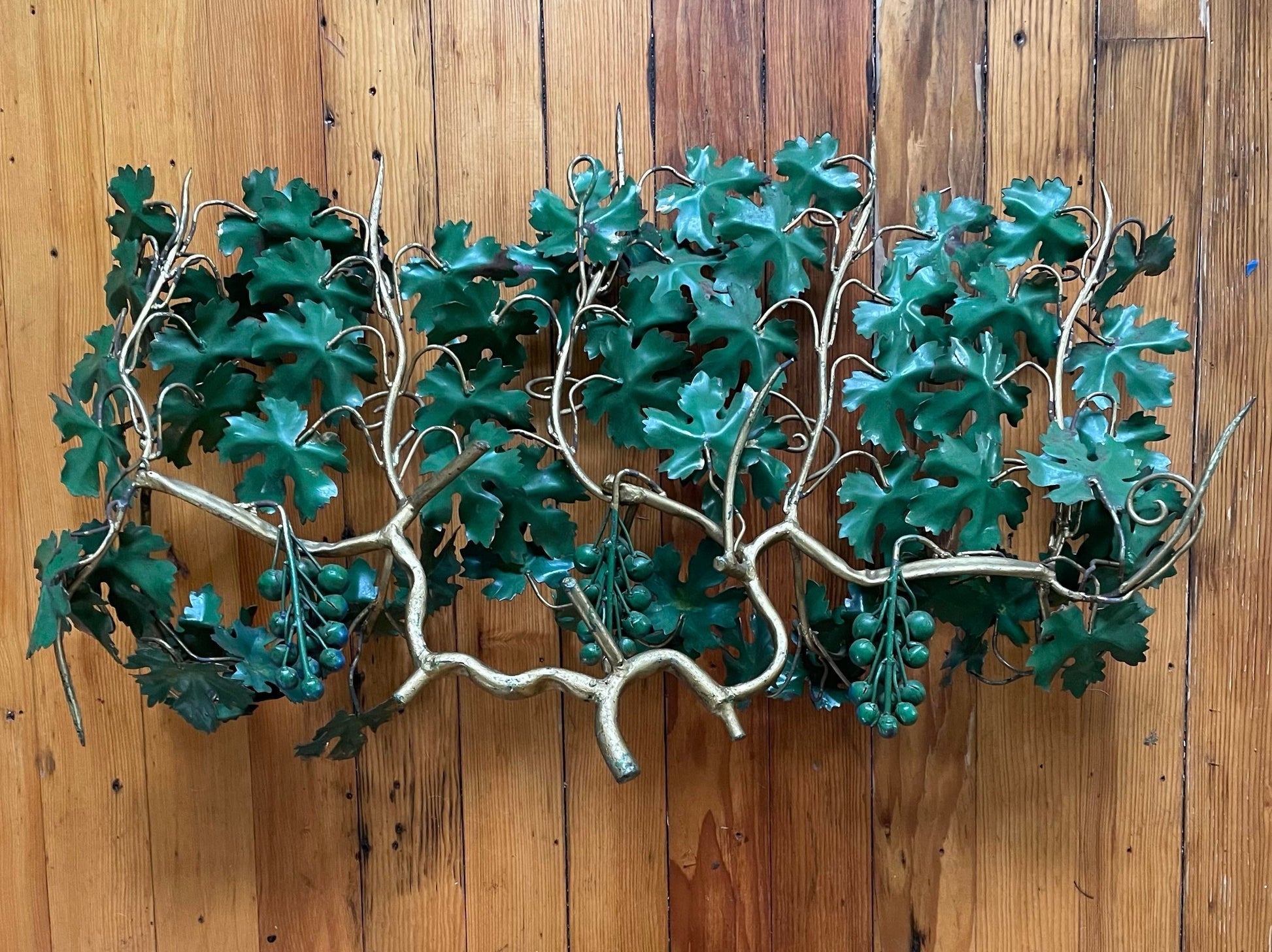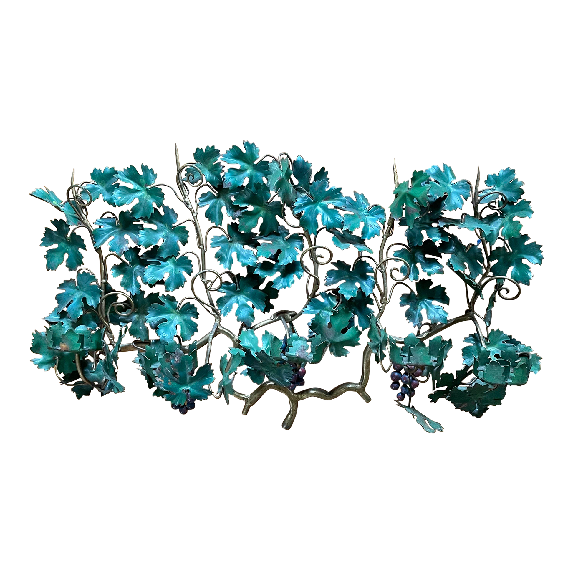 Hojas verdes pintadas, uvas, detalles de hierro dorado.