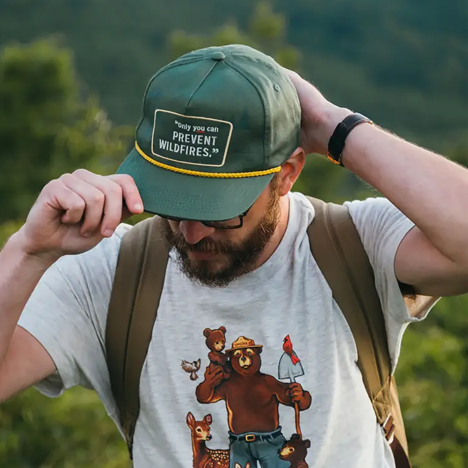 Difunde el mensaje de Smokey Bear para prevenir incendios forestales dondequiera que vayas con la gorra de The Landmark Project del Servicio Forestal.