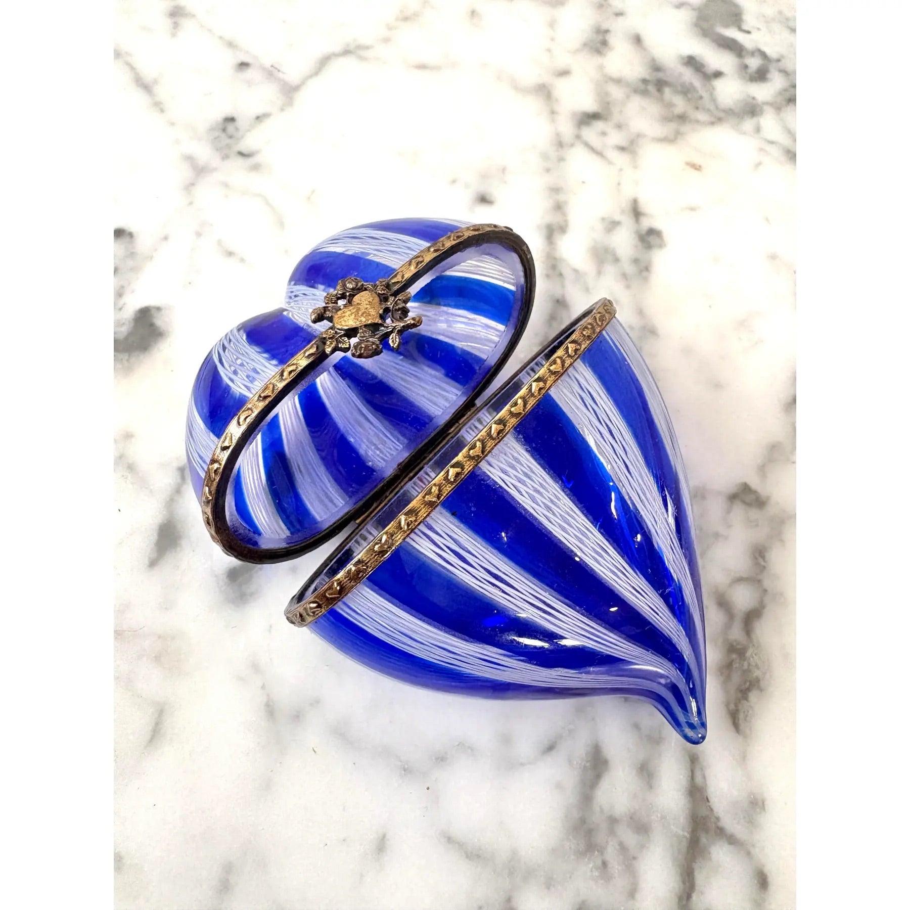 Una bombonera de cristal veneciano con forma de corazón, con soportes metálicos, Murano, Italia, alrededor de los años 70. Caja de cristal blanco y de colores arremolinados hecha a mano mediante el proceso conocido como Latticino.