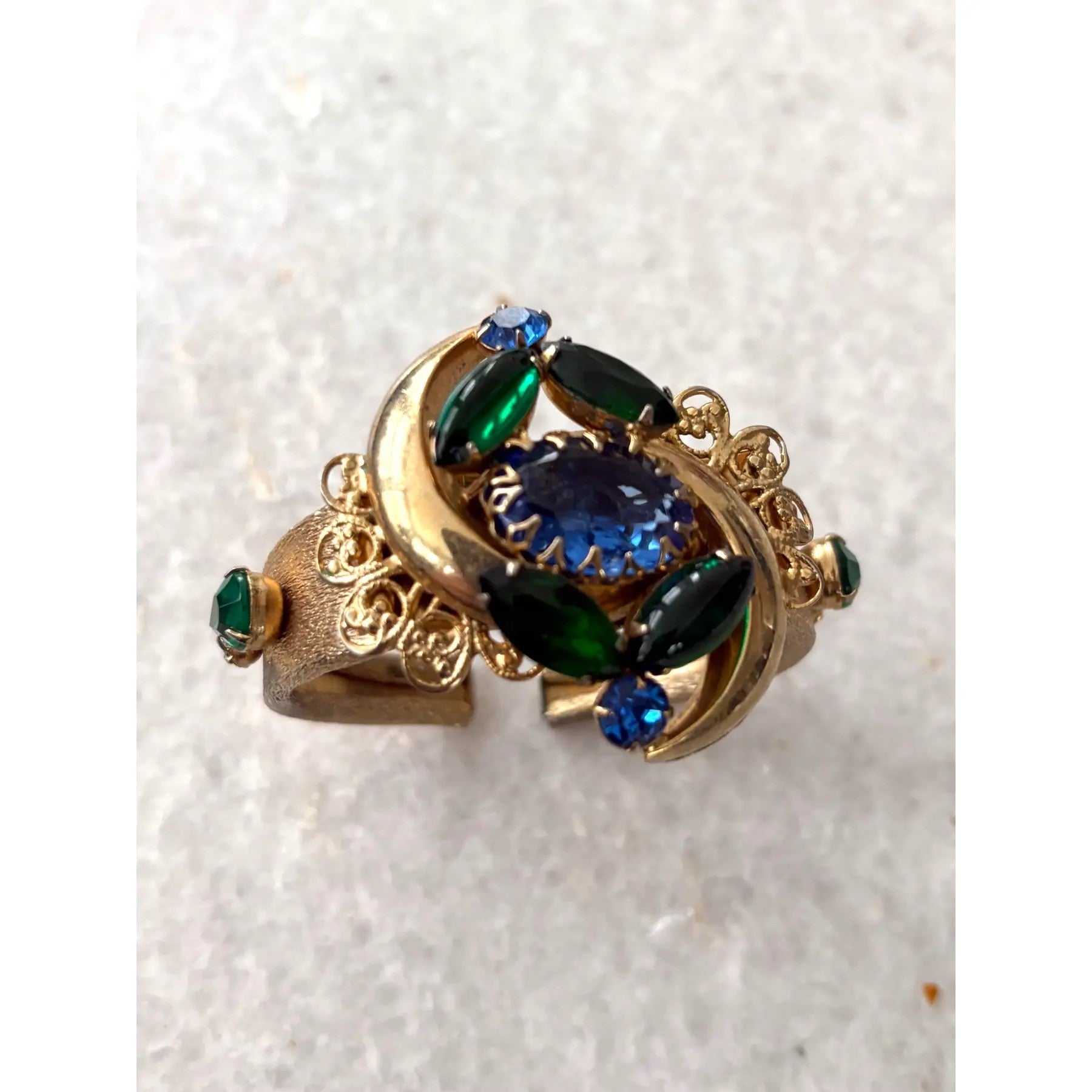 Pulsera rígida de diseñador vintage impresionante Selro Selini azul verde. Metal tono dorado y pedrería. Lados con bisagras.