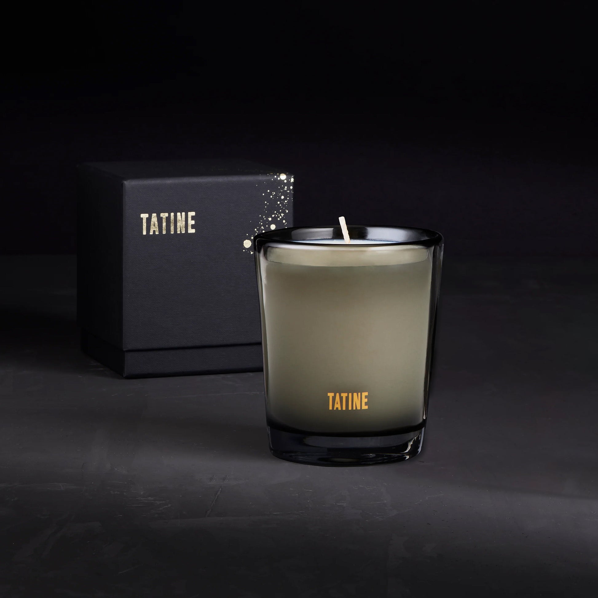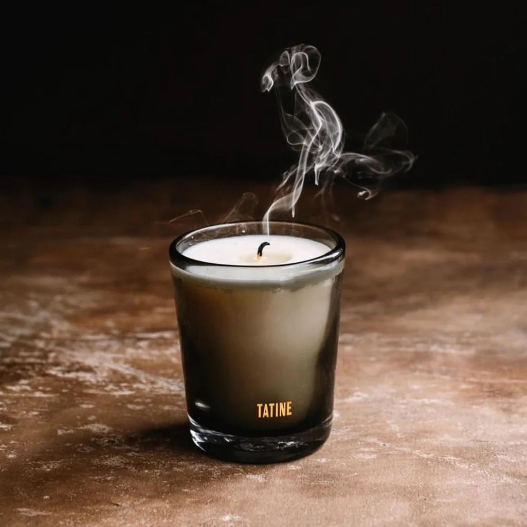 - Vela de cera natural en vidrio soplado artesanal de color gris humo