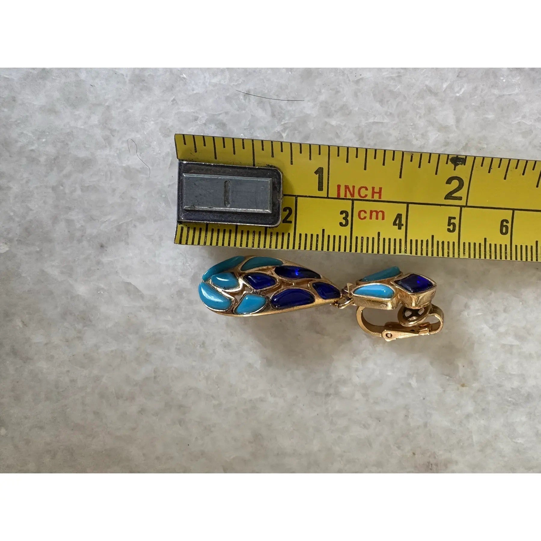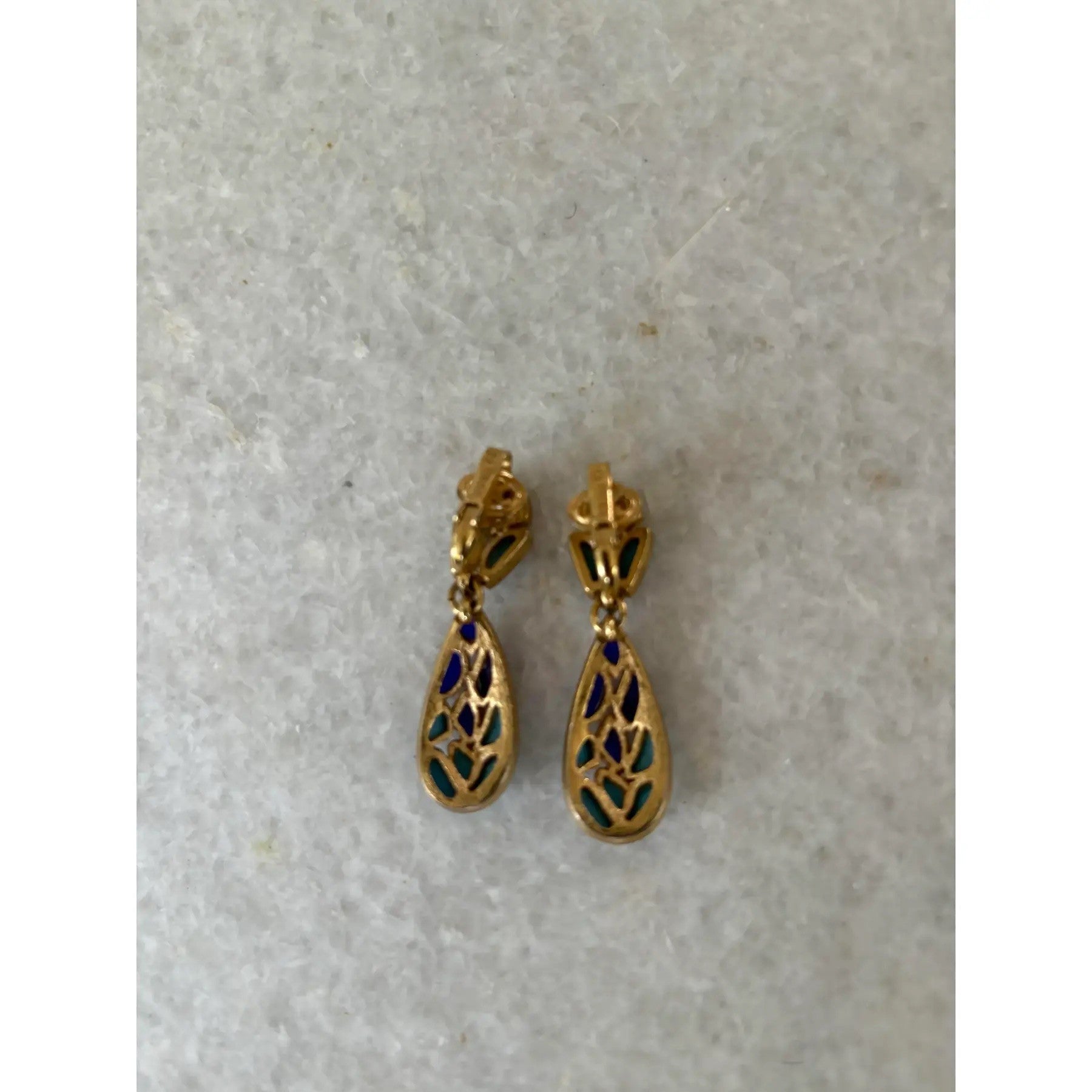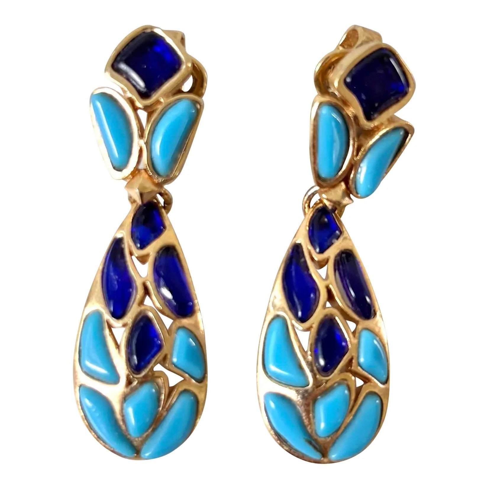 Pendientes de clip Trifari chapados en oro con mosaico en forma de lágrima.