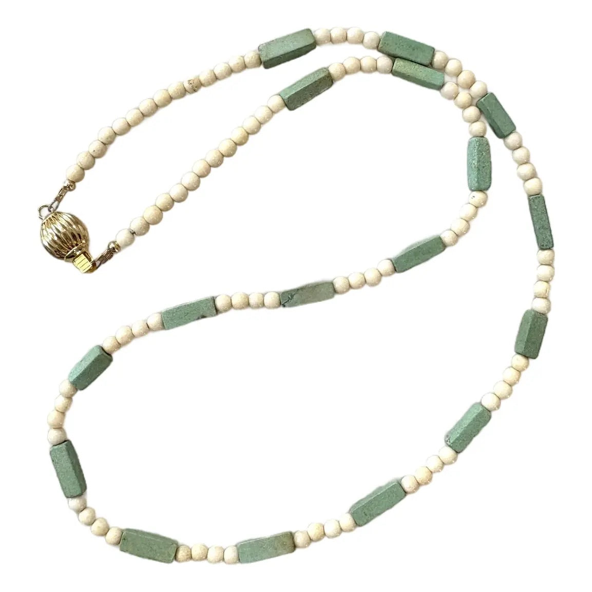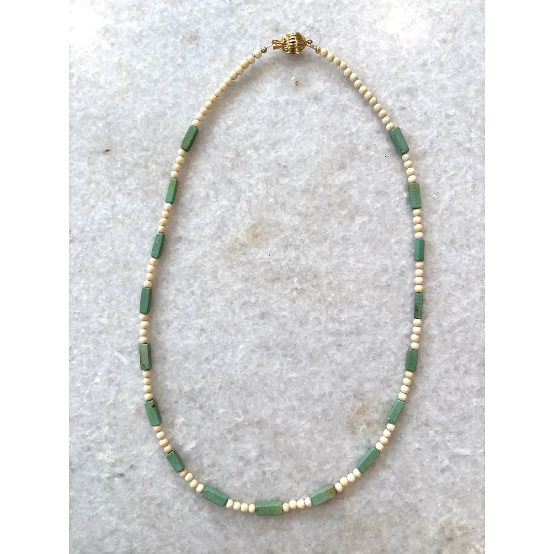 Precioso collar de turquesa vintage con cuentas de hueso espaciadoras y cierre tono dorado.