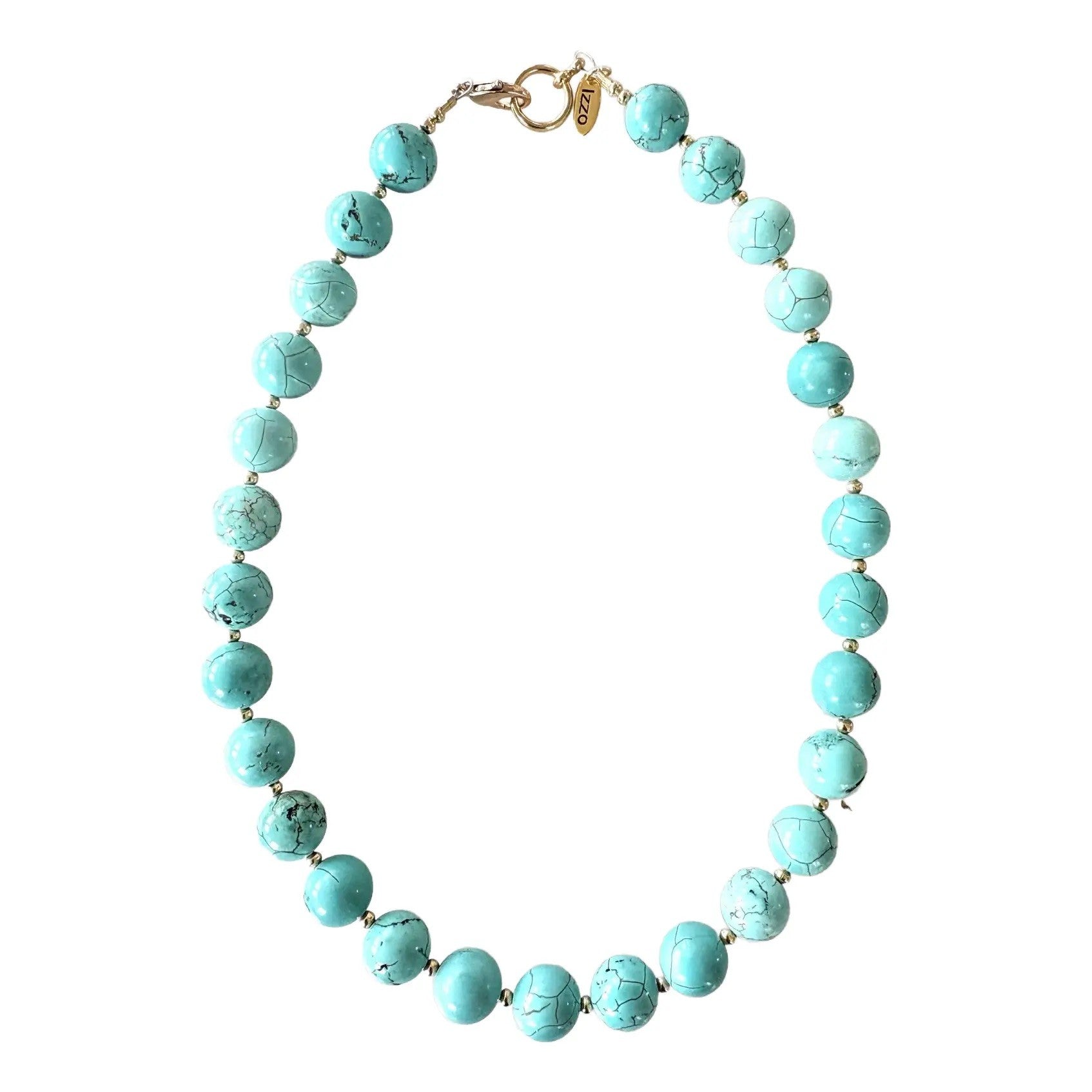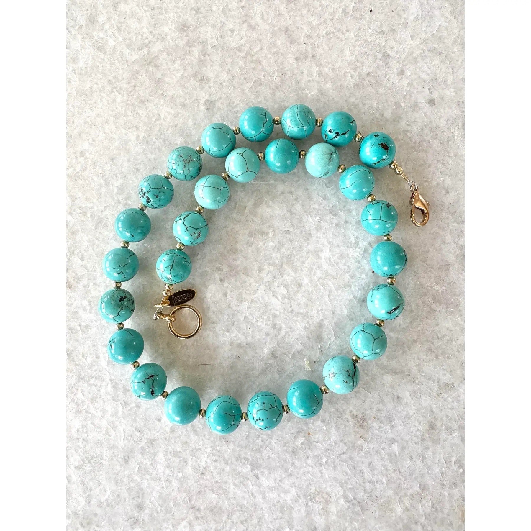 Precioso collar de cuentas turquesa con tono dorado, separadores y broche diseñado por Matthew Izzo. 45.72 cm de largo, cuentas de 12 mm.