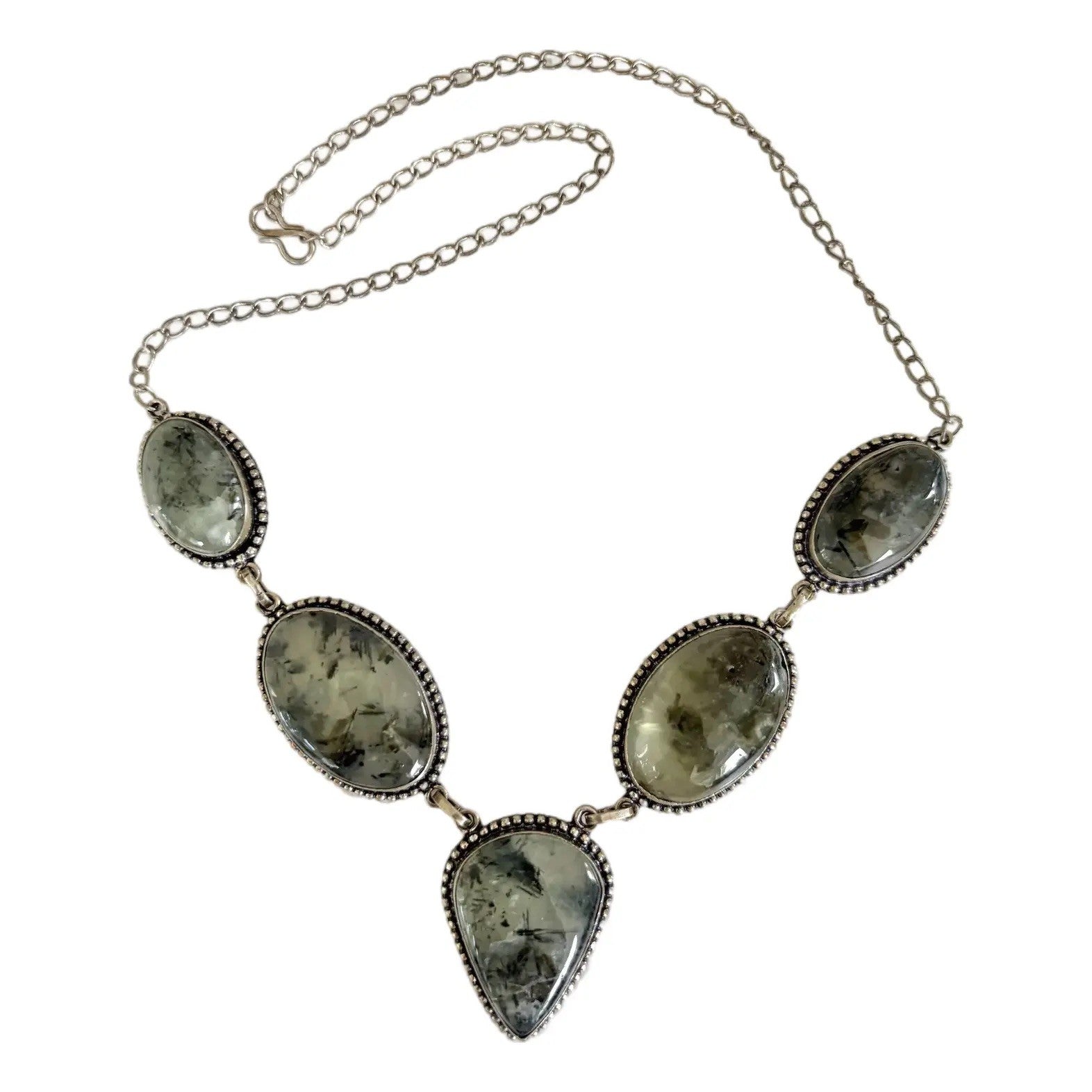 Un collar de prehnita maravillosamente único engastado en plata de ley.