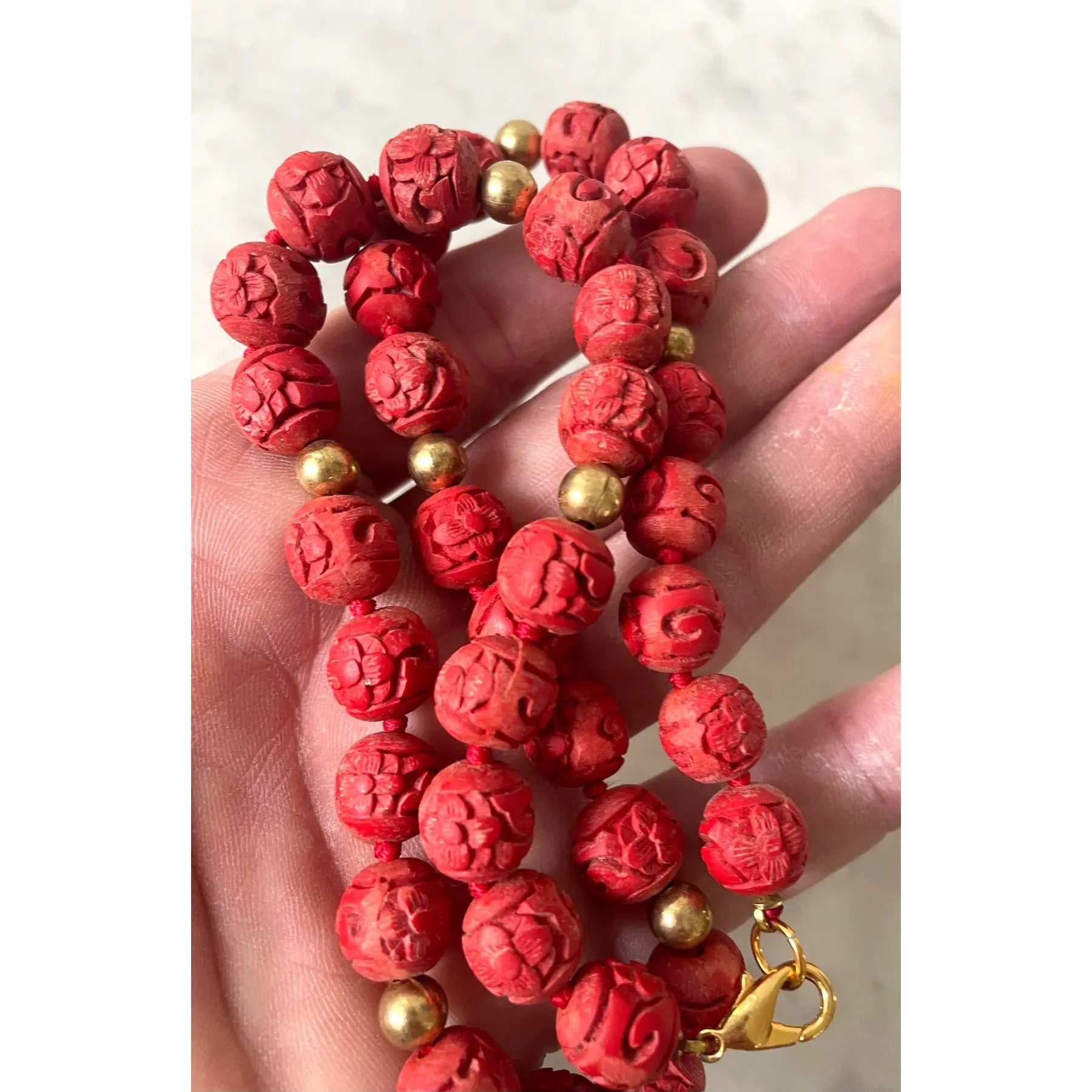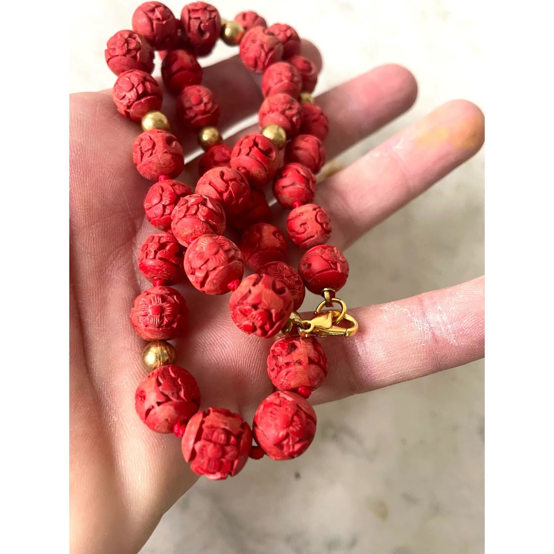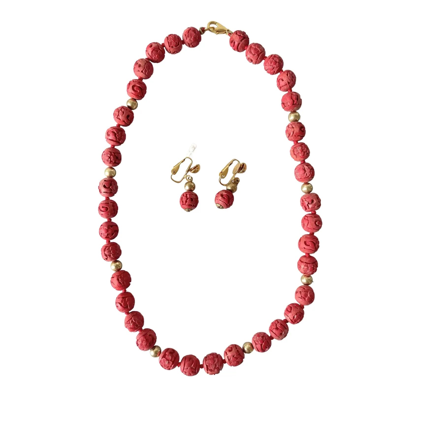 Conjunto de collar y pendientes de clip chinos de cinabrio vintage
