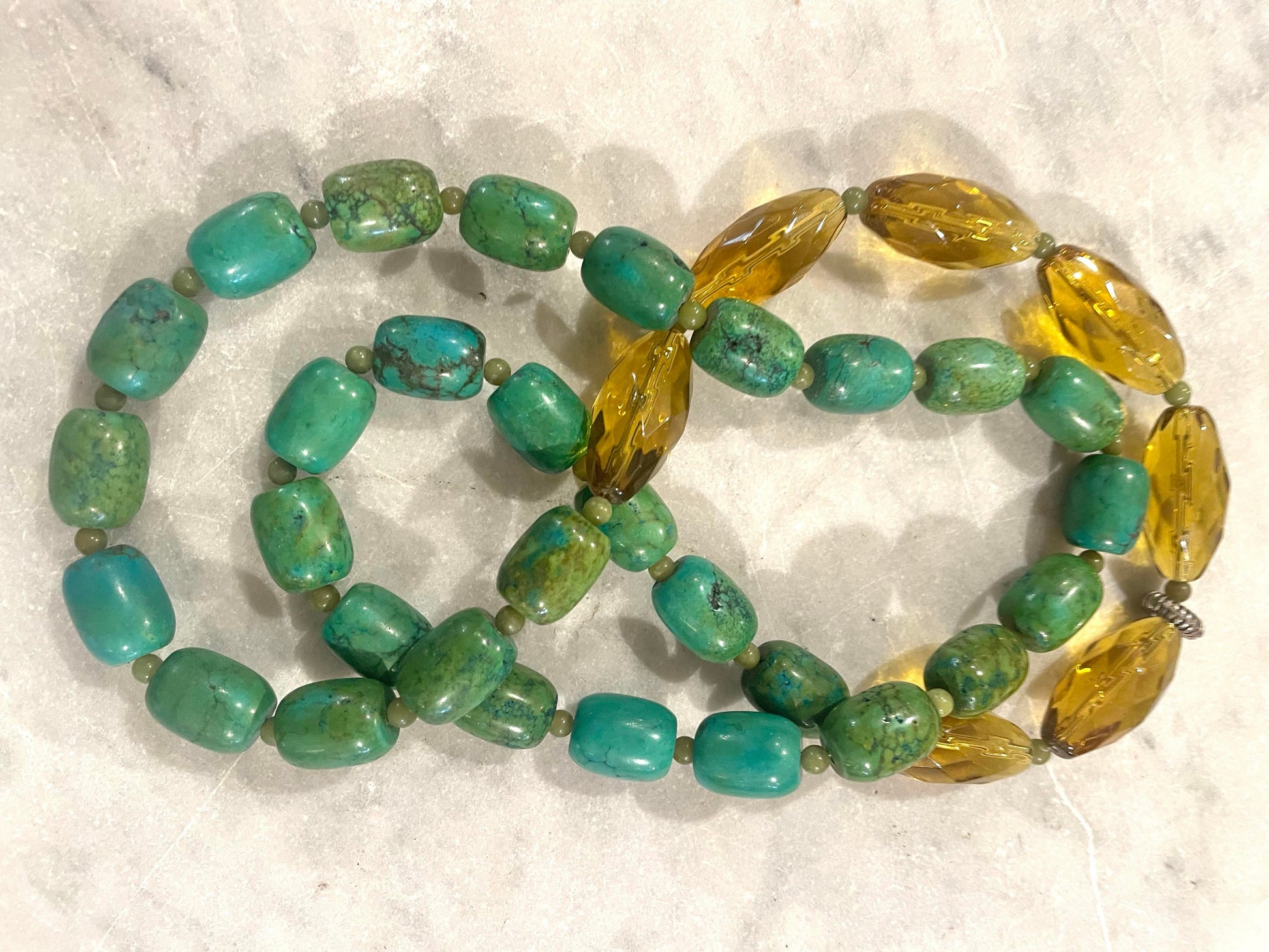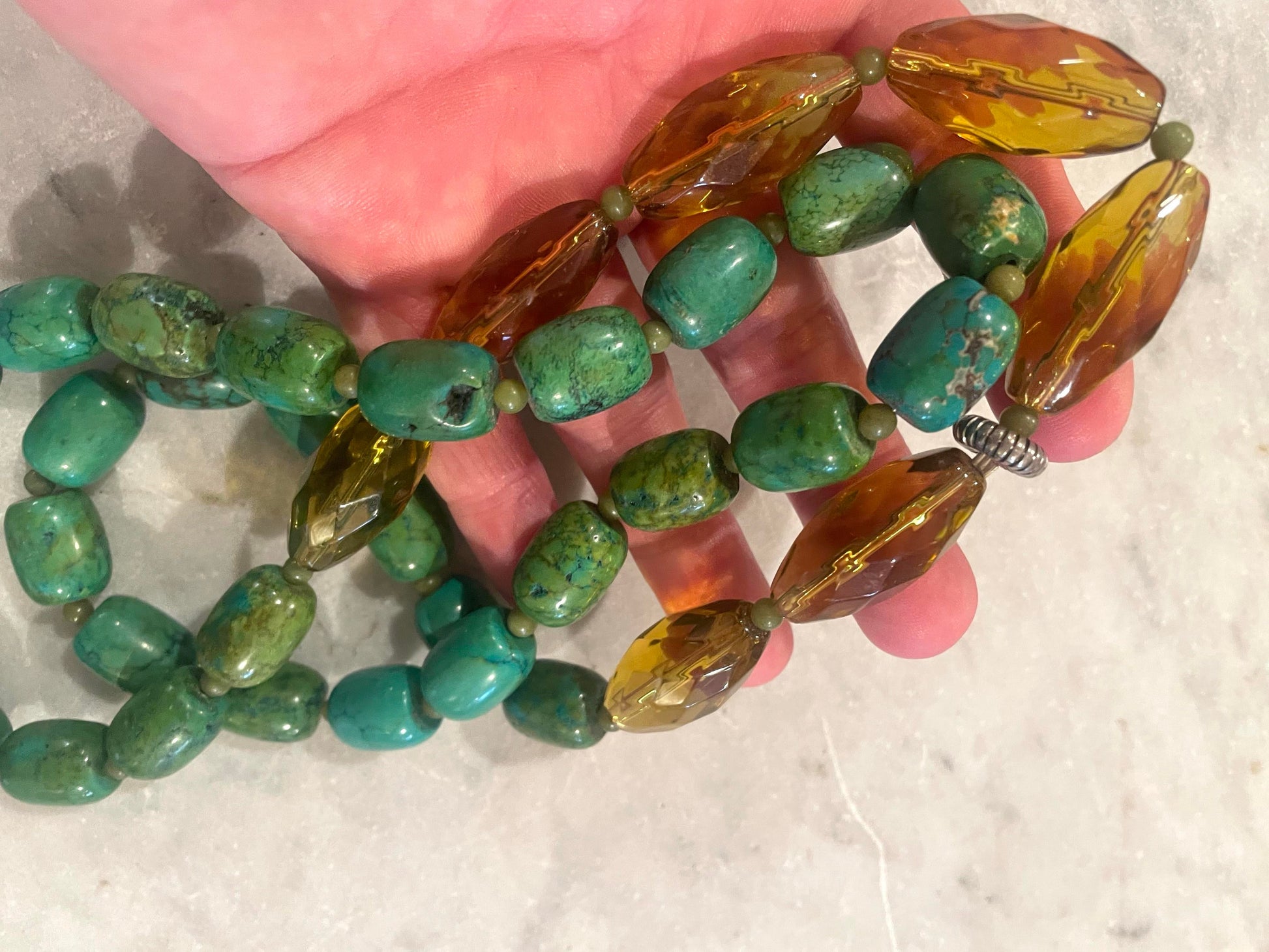 Impresionante collar vintage de jade turquesa y cristal. 26”