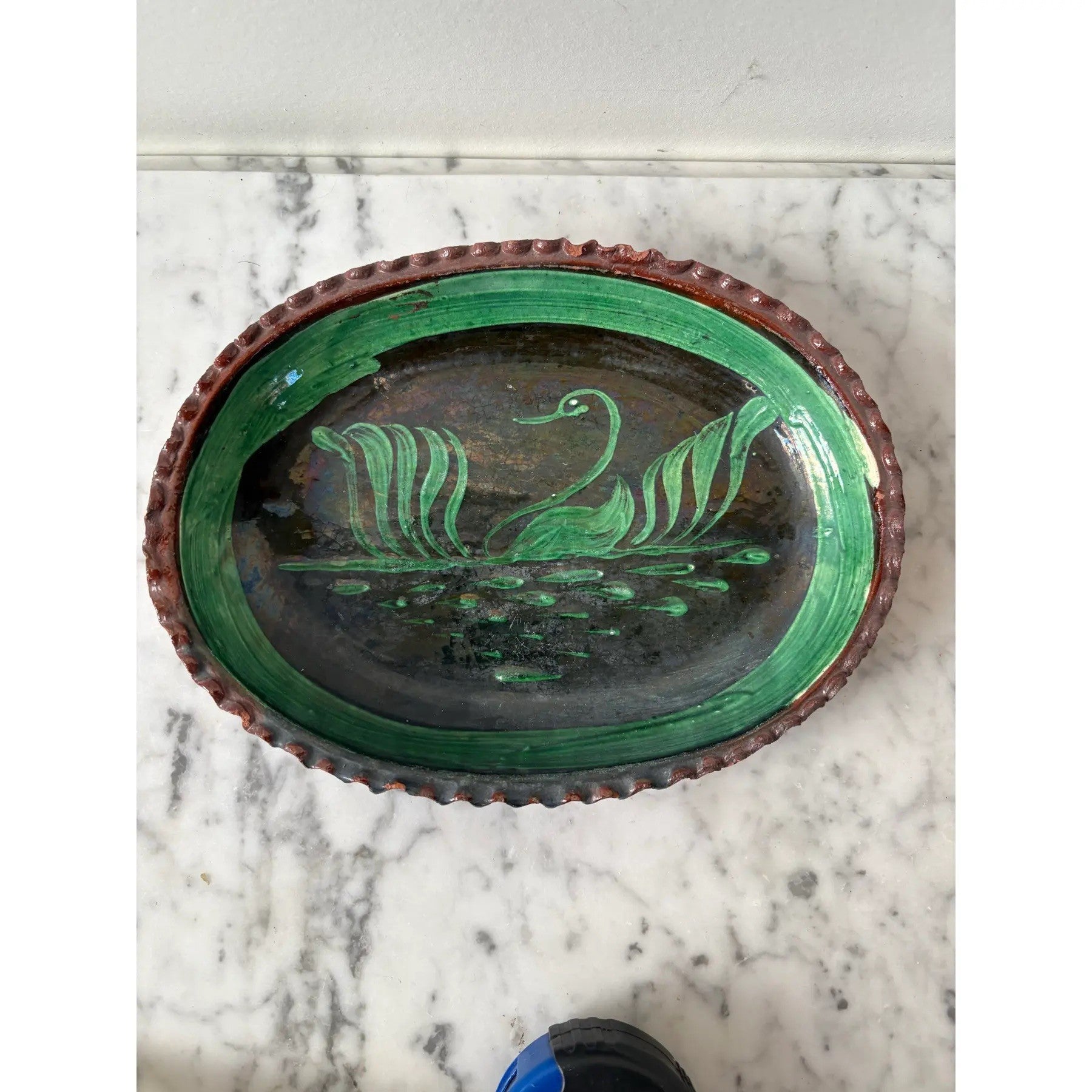 1930s Patamban Michoacan, Mexico Green Glaze Redware Pottery Platter. Handpainted Swan Oval Design